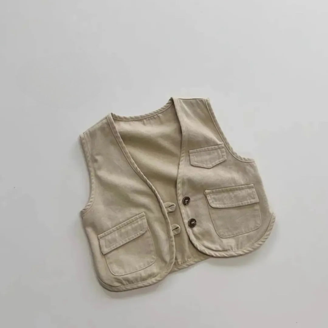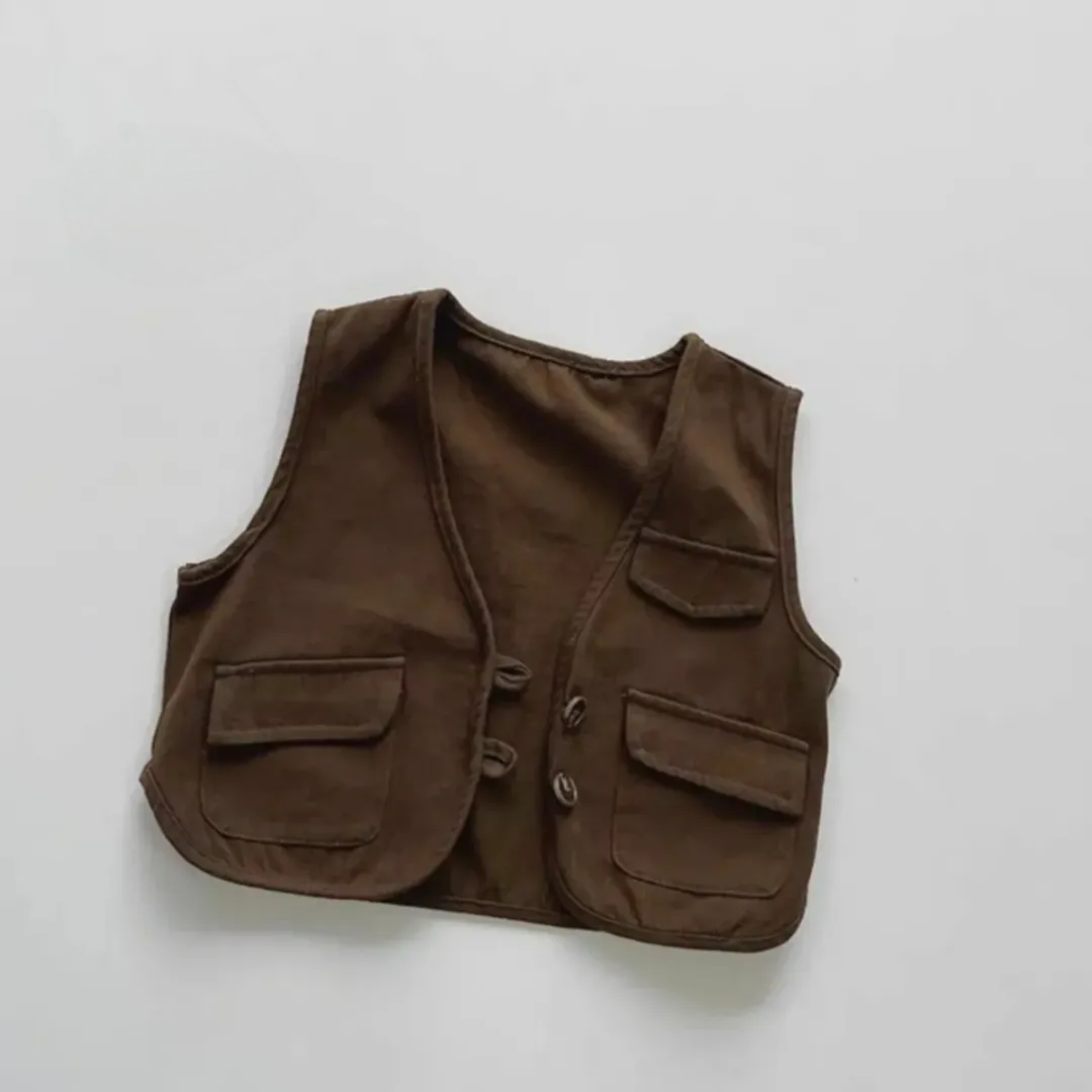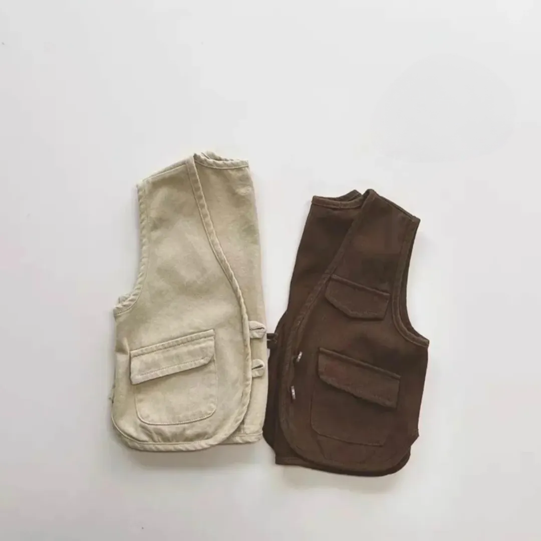 Stylish and comfortable kids’ casual wear set featuring two trendy sleeveless vests. Made from soft, breathable cotton fabric, these vests are perfect for layering over shirts or tees. The design includes a front button closure with a cute knot detail and multiple functional pockets for a classic touch.
