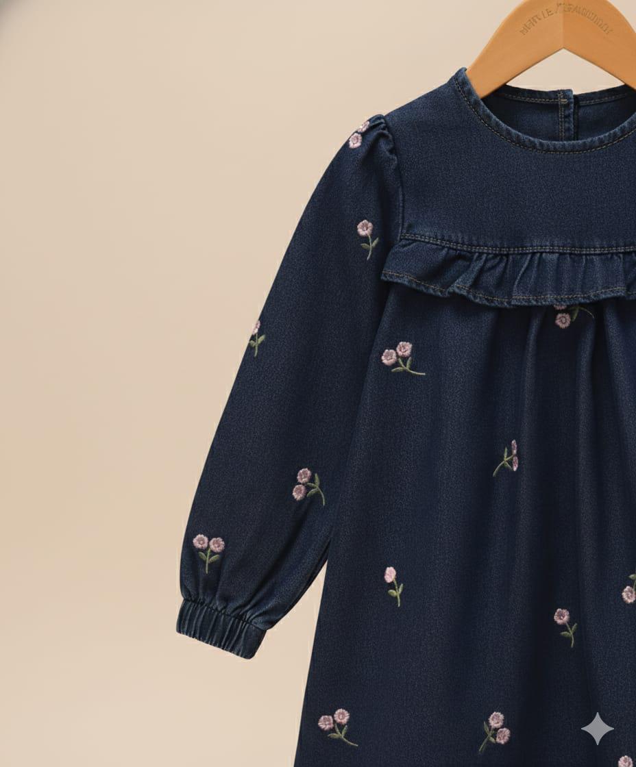 Made from soft, breathable denim fabric, this long-sleeve frock features delicate hand-embroidered pink flower patterns, a ruffle neckline, and elastic cuffs for a snug yet airy fit. The beautiful dark-navy tone makes it suitable for any season — ideal for both summer outings and winter layering.