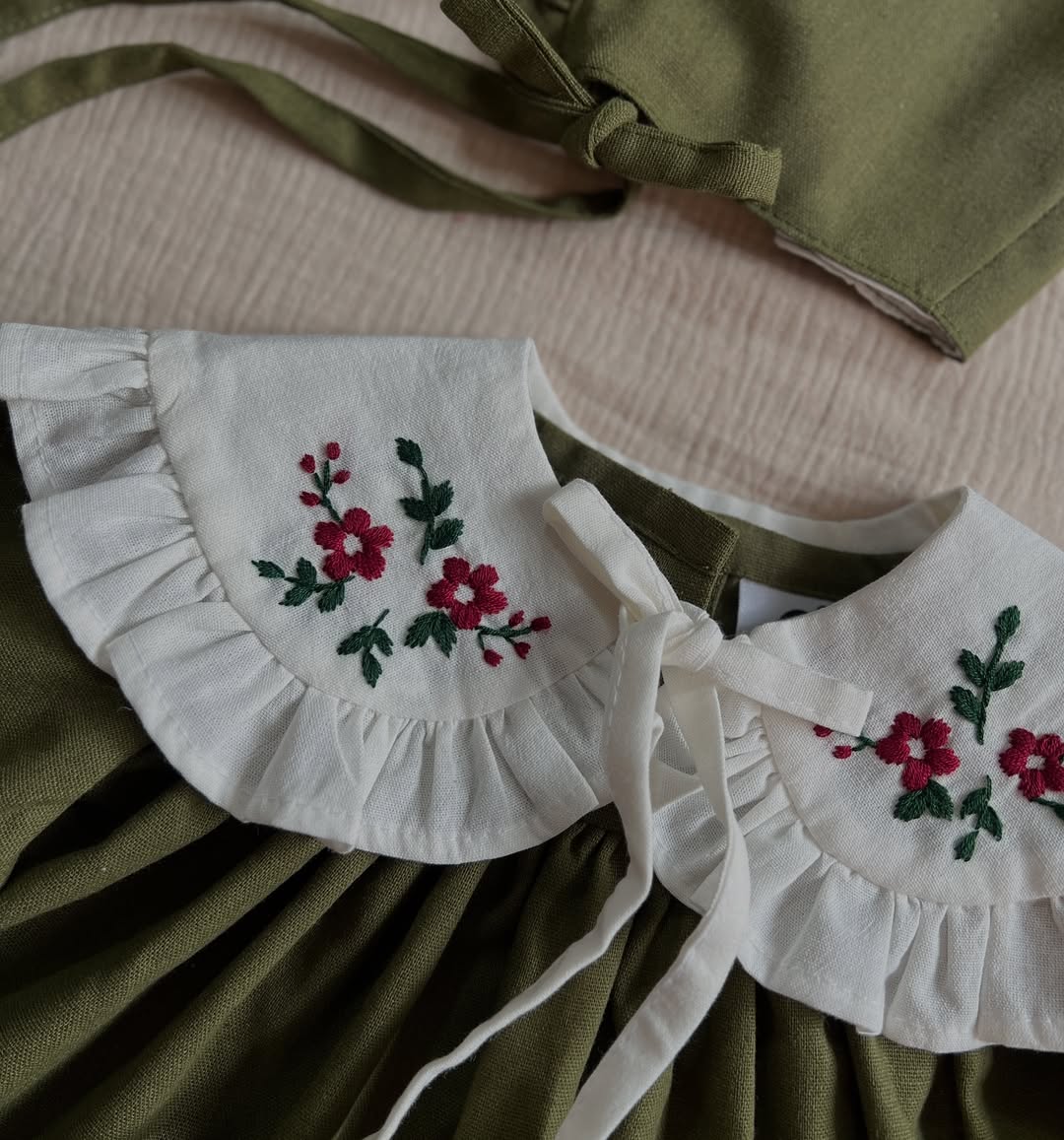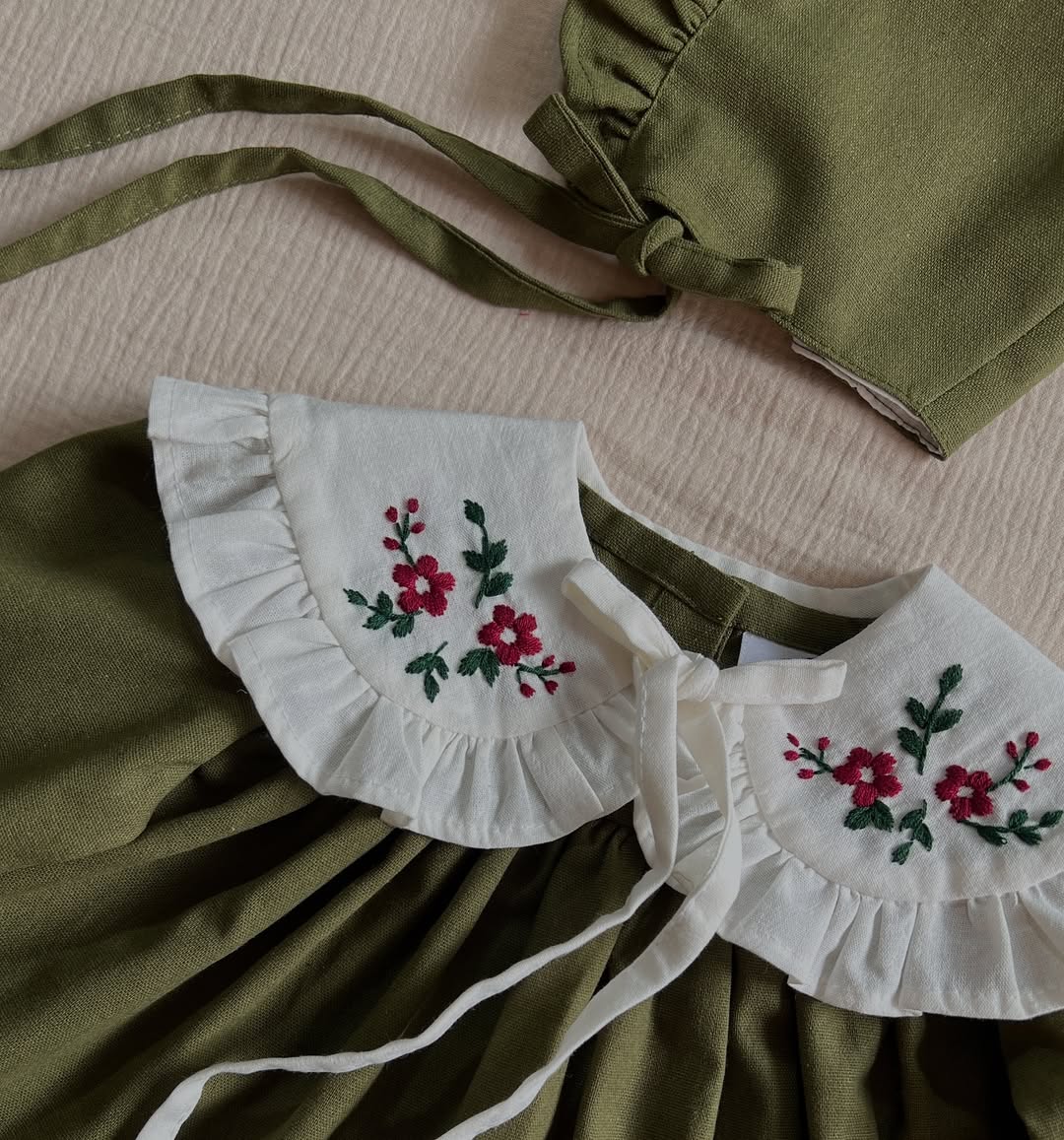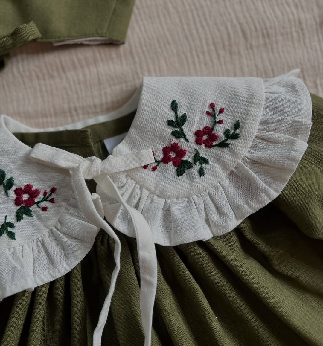 A beautifully handcrafted baby dress set in an earthy olive tone. Designed with a soft cotton base, this outfit includes an embroidered Peter Pan collar, puffy sleeves, and ruffled hemline.
